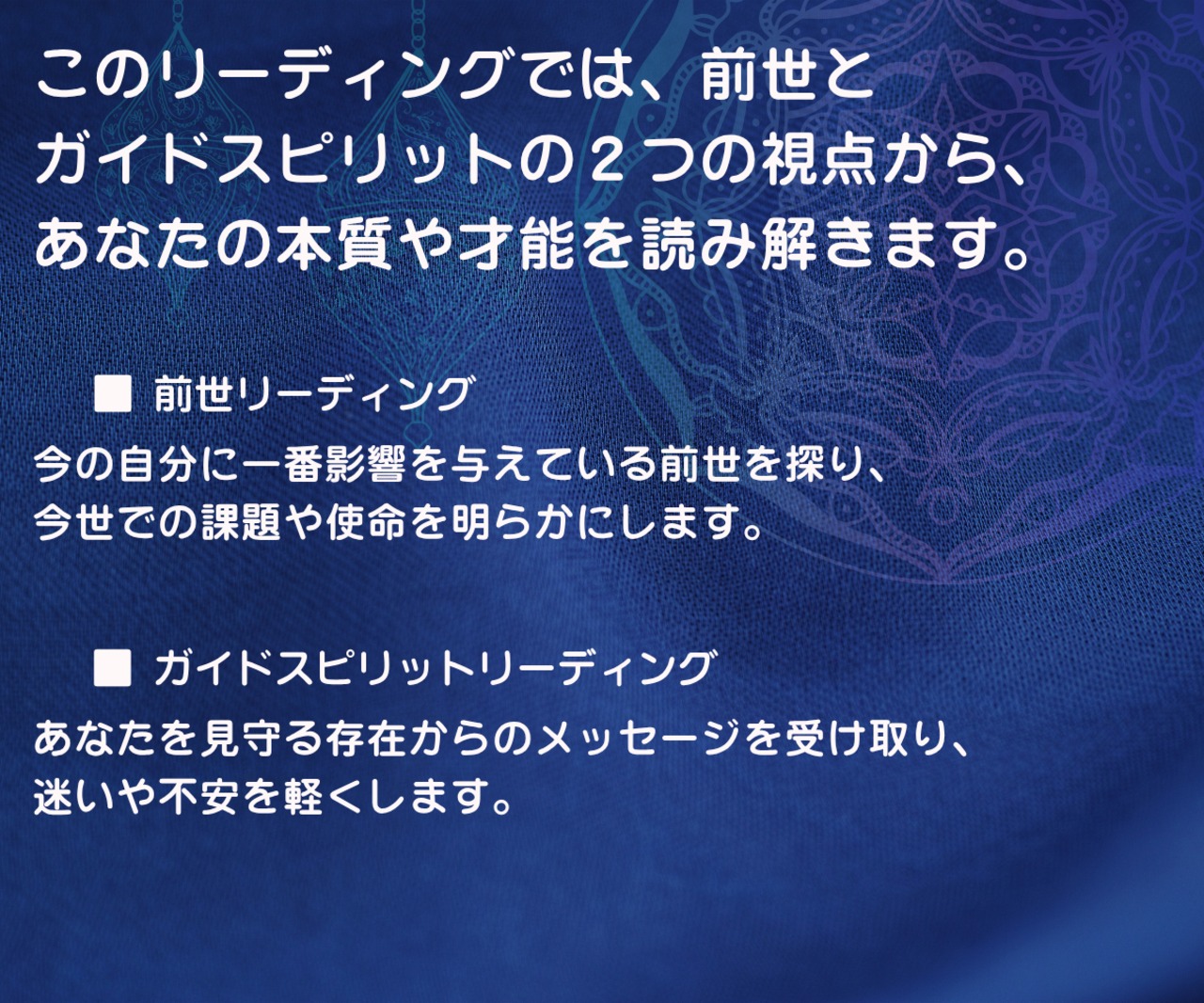 前世・ガイドスピリットの2つの視点から、今のあなたを映し出し、心の整理と現実での一歩をサポートします。