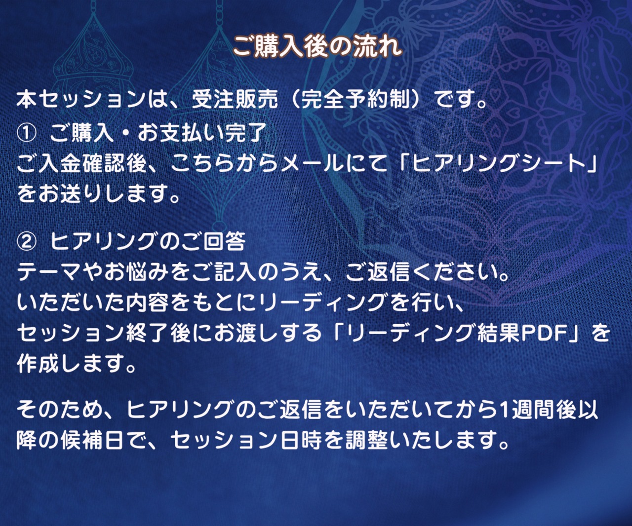 ・ご購入後、1週間以上ご連絡がない場合は、いただいた情報をもとにリーディングを進め、納品とさせていただきます。